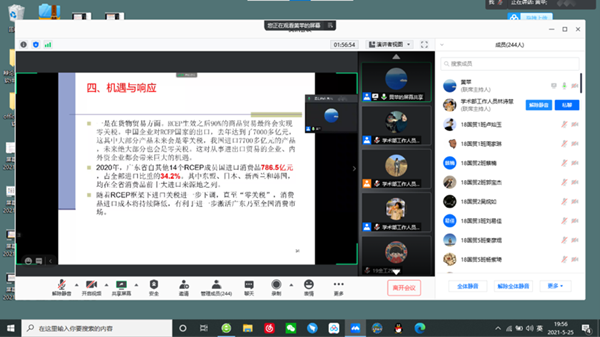 本网讯(记者 赵晓灿)5月25日晚上,经济学院举行以“RCEP助力双循环新发展”为主题的62期经济学线上论坛。出席本次线上论坛的有:经济学院院长杨星,党总支书记副院长、蒋金良,副院长王业雯及经济学院其他教职员工,共244名师生参加了本次论坛。