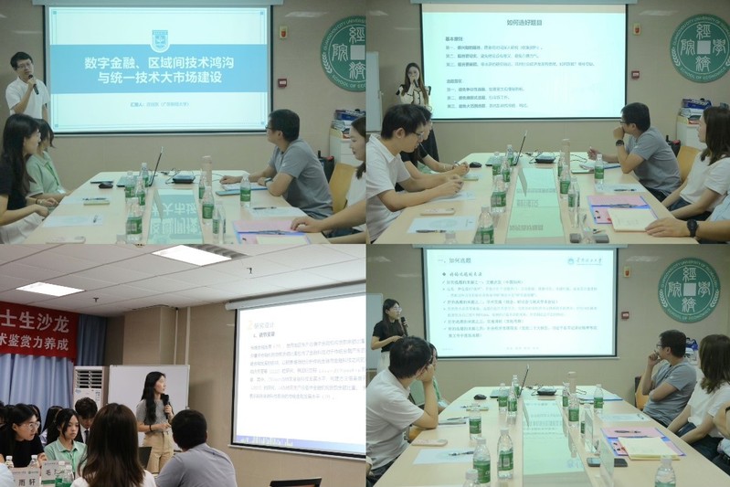讲座中,各位主讲人与同学们深入探讨了学术金融学论文选题的方向、方法以及学术鉴赏能力养成的意义。首先,颜梦洁从“营改增”对地方政府隐性债务规模的影响的角度进行分析讲解了学术论文的选题方向。其次,庄旭东讲解了他对数字金融、区域间技术鸿沟与统一技术大市场建设方面的研究。接着,毛晓蒙分享了关于学术研究的经验。林曦与大家探讨了金融科技能否化解系统性金融风险的相关问题。最后,詹姝珂分享了她对于金融科技对普惠金融与绿色金融协同发展的驱动效应的相关研究。