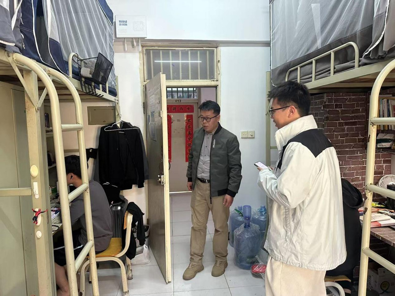 任远书记与张劲翼老师深入学生宿舍关注学生生活(刘坤钊 摄)