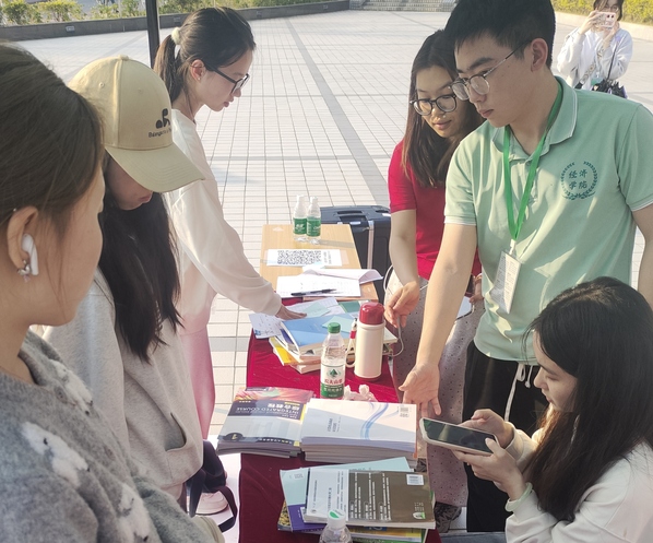 经济学院团委实践部与党务办公室联合举办:党务办公室成员负责捐赠登记与奖励兑换,以严谨流程保障活动规范;实践部成员则按学科分类、出版年份精细整理书籍,短时间内便形成知识“书山”。后续志愿者对书籍进行二次筛查、修复与标签更新,确保每一本书都能高效流转至有需要的群体。