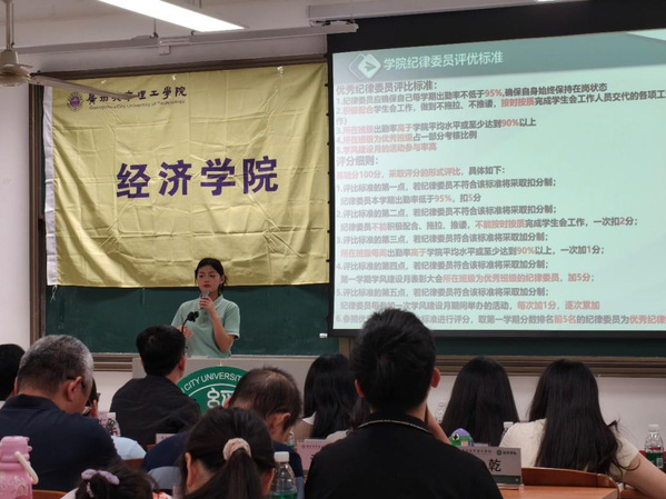 随后,经济学院学风建设部部门负责人王姝娴同学对本次学风建设月内容进行了详细的讲解,包括考勤工作、班级评优标准,并对同学们提升技能、考取证书进行指导。这为优良学风的建设指明了前进方向。