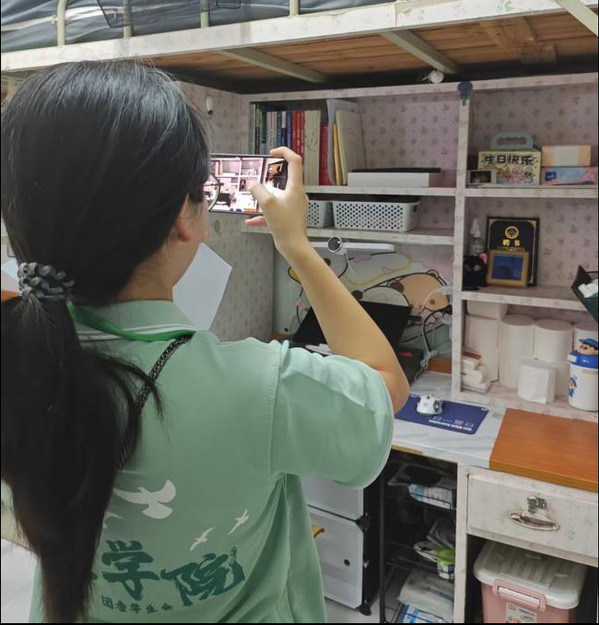 工作人员走访宿舍进行实地评分(毕心怡 摄)