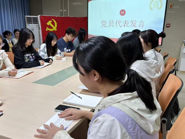 紧接着,党员代表们围绕“锚定评估践初心,团结奋斗谱新篇”主题发表精彩发言。学生党员赵晶认为评估是深度自我审视的“镜子”,能精准呈现教学成效与不足,助力学校改进提升。她结合自身从大学迷茫到明确目标、努力成长的经历,为同学们提供自我提升思路。身为党员代表她承诺将初心融入评估各环节,发挥先锋模范作用,带头遵守校规、严谨治学,积极参与评估活动,团结同学形成合力。她呼吁全体同学携手,以昂扬斗志和扎实行动锚定评估目标,为学校教学工作高质量发展贡献力量。