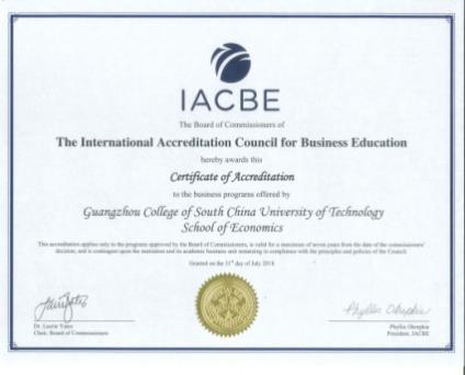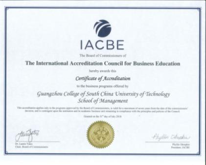 2018年7月,华南理工大学广州学院顺利通过IACBE正式会员资格评审,国际经济与贸易、工商管理、会计学、市场营销4个专业获得正式会员资格,我校成为中国第一所获得IACBE国际商科认证的大学。2019年5月,人力资源管理等3个专业也顺利获得认证,管理学院实现全专业认证。2019年8月,国际商学院国际经济与贸易(双语班、国际班)、会计学(双语班、国际班)也顺利获得认证。