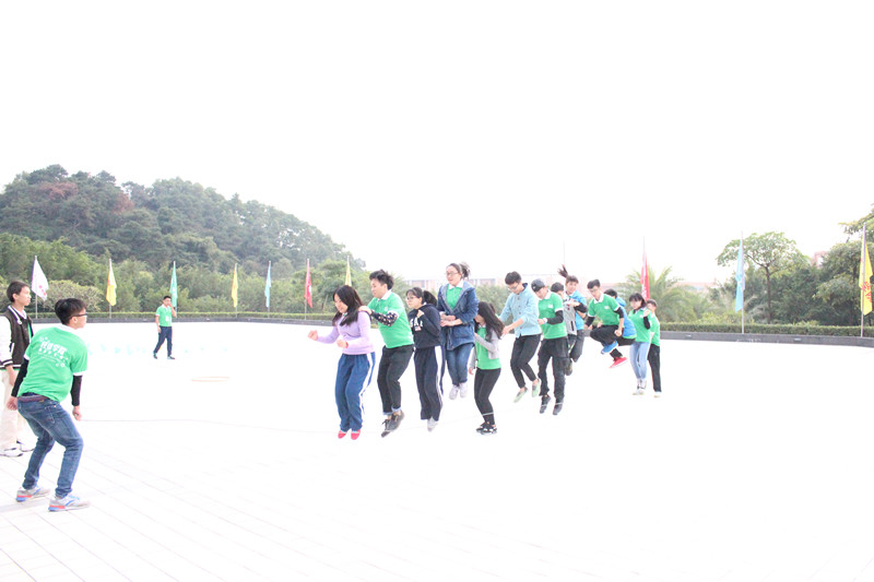 经过几个热身小游戏后,各小组成员返回到活动中心广场,素质拓展活动也进入了最激动人心的趣味运动环节。其中,属“趣味跳大绳”游戏最能考验同学们的默契和配合。这个游戏需要全体成员参与,由两人负责摇大绳,全组成员齐跳累计跳3个则算任务完成。游戏一开始,许多小组在试跳之后,发现成员的位置安排并不理想,经过大家的不断调整和尝试,最后终于通过了这场默契考验。
