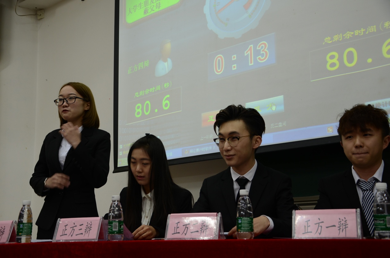 比赛由“嘉宾致辞”、“揭幕赛”、“班级代表抽签”三个环节组成。辩手们围绕“大学朋友圈应不应该屏蔽父母”这个话题展开激烈辩论,在展示他们个人口才的同时,也体现了当代大学生对于父母与子女之间情感与交流沟通的关注与思考。整场辩论赛精彩不断,高潮迭起,台下的掌声此起彼伏。