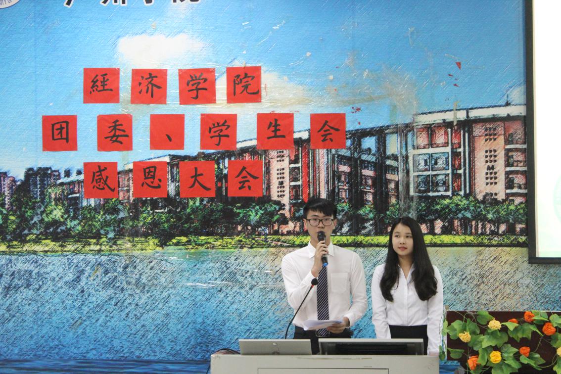 在即将换任之际,为了感谢老师、常委以及部长们的辛苦付出,经济学院第二届、第一任团委、学生会于5月15号晚上在A8-101举办了以“经历风雨,同舟共济,知遇之恩,铭感不忘”为主题的感恩大会。出席本次大会的人员有经济学院团委书记郑洋老师,经济学院团委副书记钟二妹老师以及经济学院团委、学生会的同学们。
