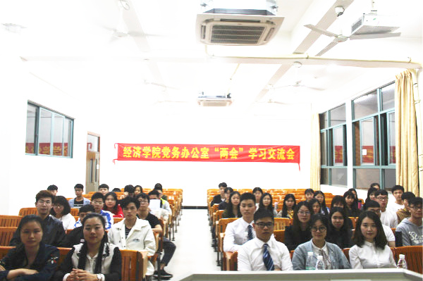 3月14日晚7点,经济学院党务办公室在A3-308顺利召开了两会学习交流会。出席此次会议的有经济学院党务办公室常务副主任王巍峰老师、经济学院党务办公室学生负责人庞旭峰同学、王艳如同学以及各党办委员和积极学习两会精神的各班同学。