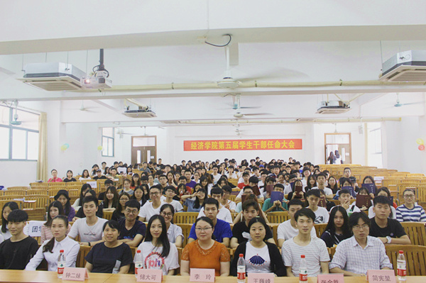 6月26日中午1点,经济学院在A5-201举行第五届学生干部任命大会。出席本次大会的嘉宾有:经济学院党总支副书记、学生工作办公室主任李玲,经济学院党务办公室常务副主任王巍峰,经济学院团委书记钟二妹,经济学院就业专员张全胜,经济学院2014级辅导员简宪堃和2016级辅导员储大可,以及经济学院各组织的常委和委员们、经济学院2015级、2016级和2017级的各班班团干。