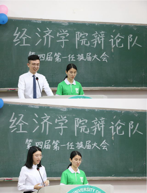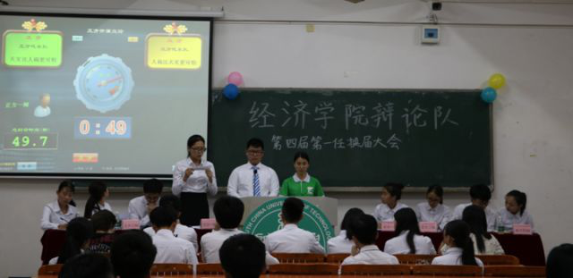 经济学院辩论队第四届第一任换届大会于6月13日晚19:00在A3-204举行,出席本次大会的嘉宾有经济学院团委学生会赵晓灿副书记、经济学院学生会汤珏臻主席、经济学院辩论队黄钦华教练、经济学院辩论队前队长李莹莹同学、黄瑛然同学、经济学院辩论队马文权队长、曾晴队长。