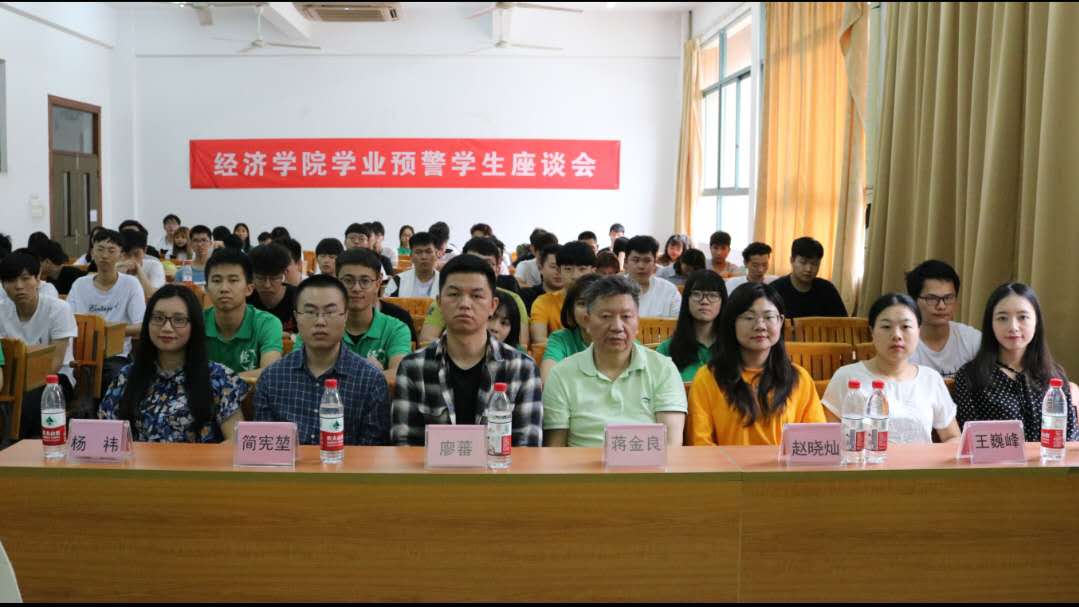 本网讯(记者杨洁虹、白玉华) 为加强学风建设,给学业预警的同学敲响警钟,提高预警学生学习的主动性和积极性,帮助预警学生顺利完成学业,4月28日下午15:00我院在A3-208召开学业预警学生座谈会。座谈会由2016级辅导员储大可老师主持,经济学院党总支书记蒋金良副院长、团委副书记赵晓灿老师、团委副书记廖蕃老师、2017级辅导员王巍峰老师, 2018级辅导员简宪堃老师以及2016、2017级教务员杨祎老师出席了本次座谈会。