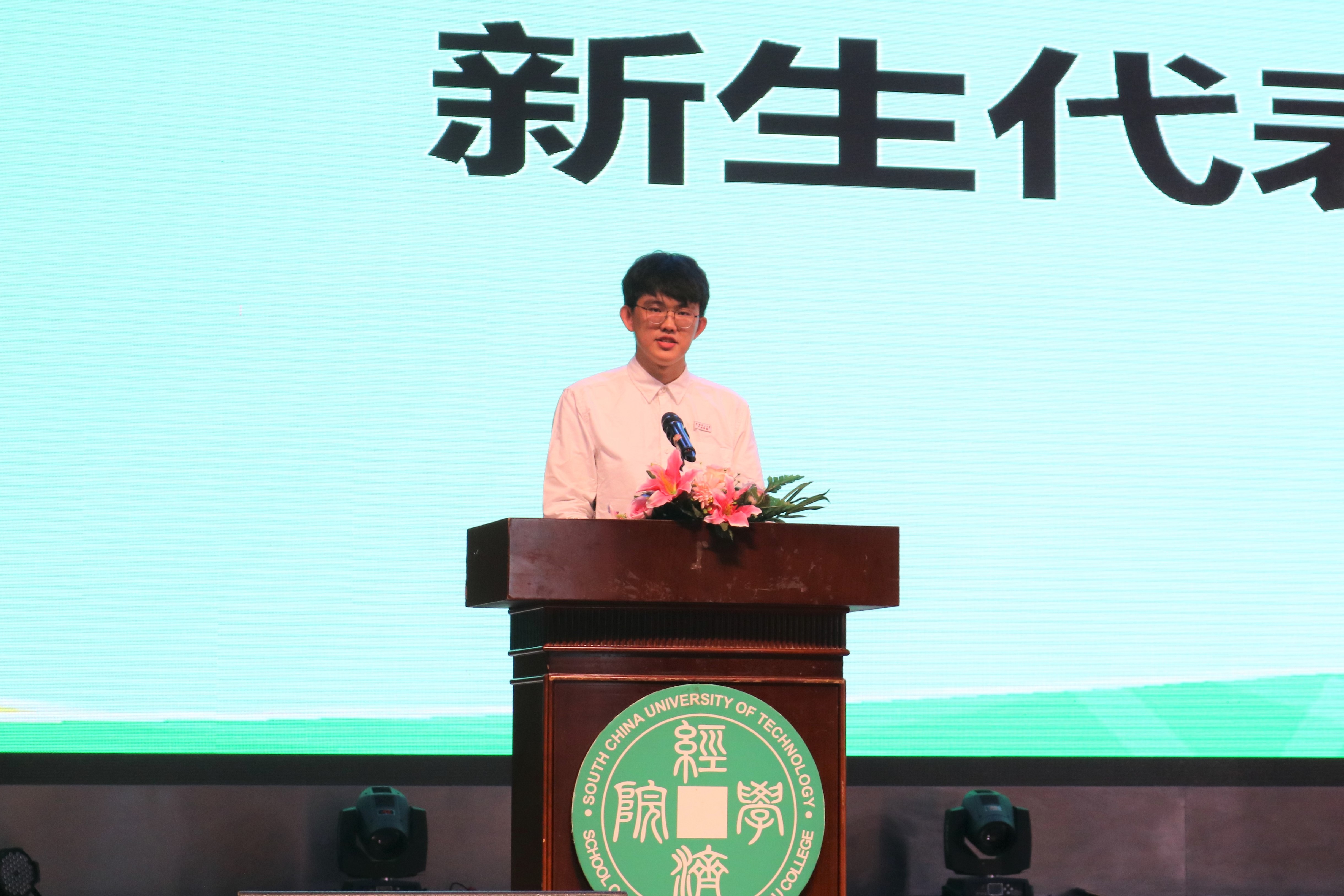 19级经济统计学一班的陈炜同学作为新生代表上台发言,他表示大学是一个全新的舞台,这里充满了机遇与挑战,希望能跟全体新生一起在奔跑中抵达新的远方。