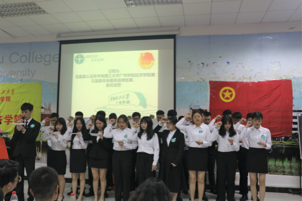 在紧张地选票统计后,总检票人黎文静同学宣读华南理工大学广州学院经济学院学生会第五届委员会委员名单。随后,各常委、委员上台庄严宣誓。