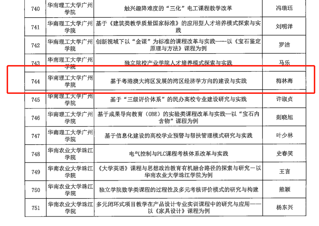 日前,广东省教育厅下发《2019年广东省高等教育教学改革项目立项名单的通知》文件,公布了2019年省级高等教育教学改革研究项目立项情况。我院经济学教研室梅林海教授主持的《基于粤港澳大湾区发展的湾区经济学方向的建设与实践》获批立项。