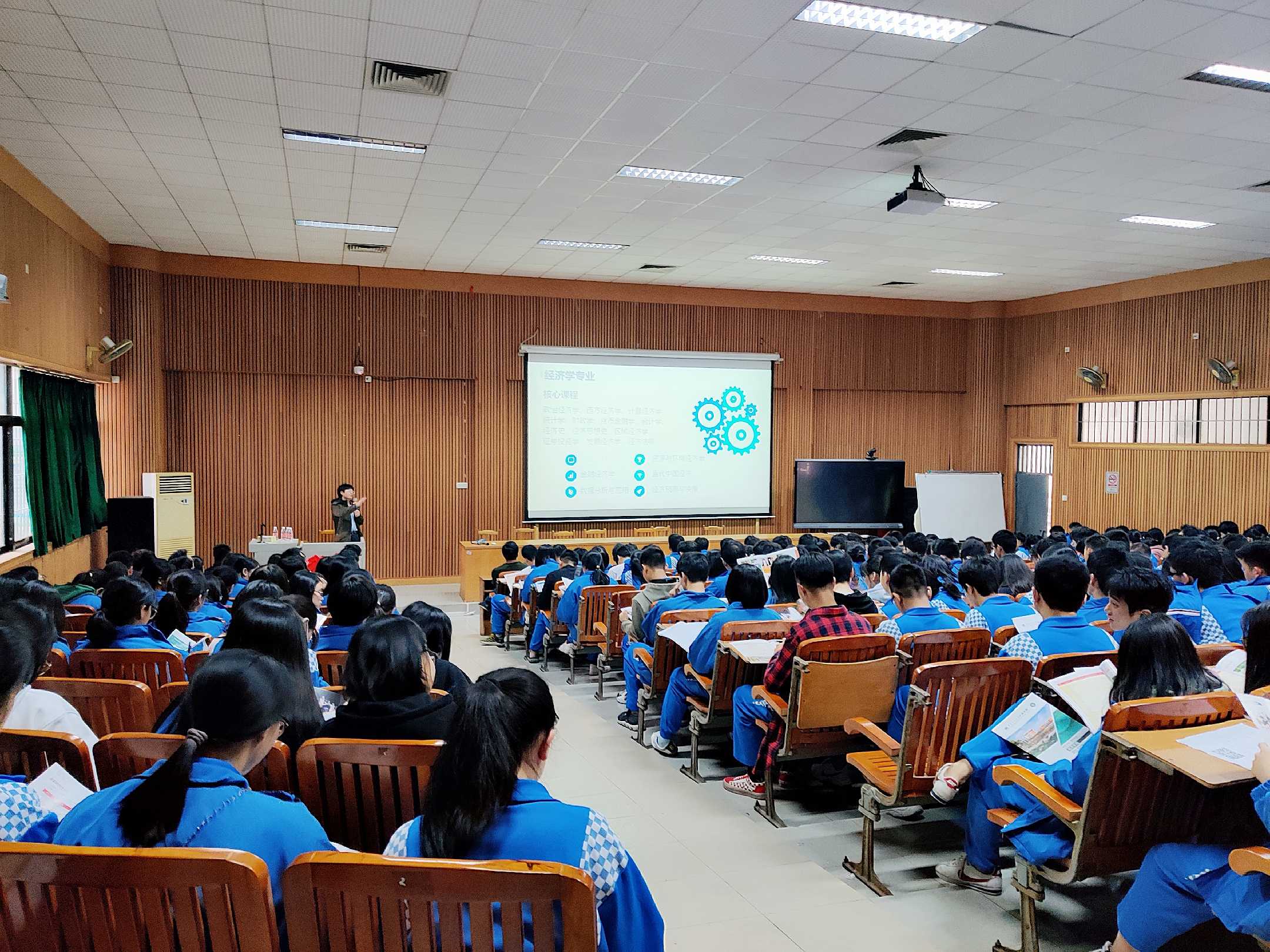 讲座伊始,蒋金良代表华南理工大学广州学院对于此次新华中学的讲座接待工作表示了诚挚的感谢,并做了关于“大学梦” 的讲话:看着同学们都朝气蓬勃,正直青春年少的好时光,必定是需要去大学深造、回报父母、回报社会的。此次代表华南理工大学广州学院来做此次招生宣传,向同学们介绍学校、介绍热门专业,希望大家能够对大家未来的报考有所帮助。锋利的剑是需要打磨的、傲骨的梅花是要经得住严寒的冬天的,想考上好的大学,必须得经过努力拼搏。同时,我们也希望通过此次讲座,也让大家更能深刻理解大学生活、大学的专业,期待大家明年高考都能考出好成绩,选择自己理想的大学。