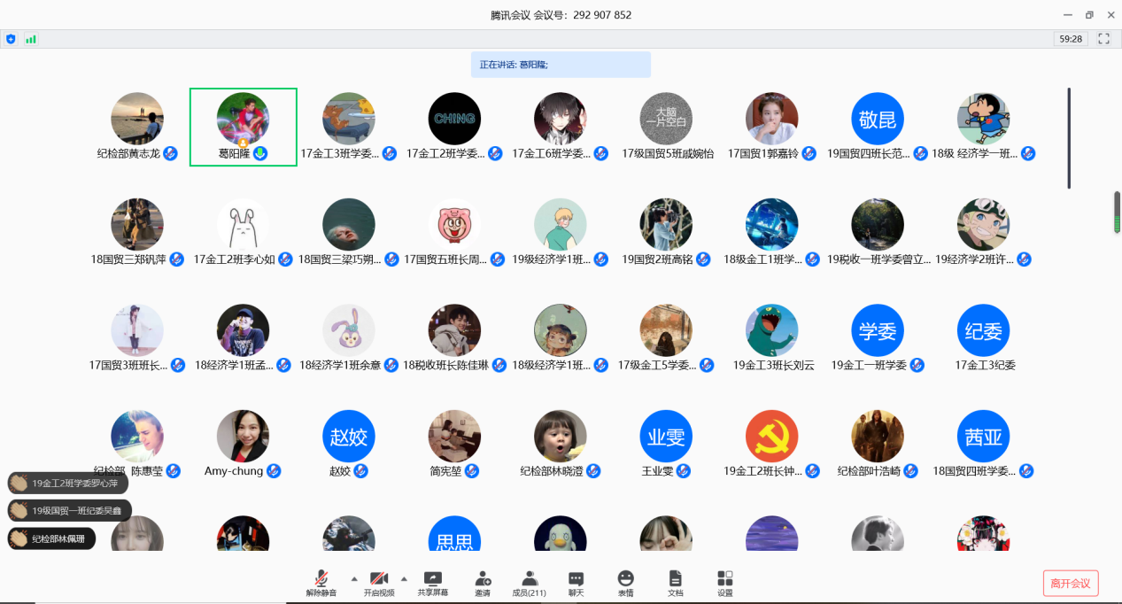 本网讯(记者 葛阳隆)5月14日,经济学院召开2019—2020学年第二学期线上学风建设月总结表彰大会。经济学院党总支书记蒋金良副院长,经济学院王业雯副院长,经济学院学工办副主任李嘉雯老师,经济学院就业专员张全胜老师,经济学院各年级辅导员,经济学院团委学生会常委,各班班委,学风建设月学习成果优秀作品获得者以及学风建设月优秀班级代表参加了此次会议。