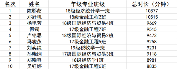 本次活动共有362名学生参与,从软件后台统计的数据来看,连续打卡14天的人数约80%,人均每日学习时长达4小时以上,在随机抽查中发现大部分同学有着清晰的复习思路,能够合理的安排自己的时间。学习总时长排名前十的同学作为期末复习的楷模,分别得到了学院的嘉奖。“云”自习活动为同学们搭建了一个期末复习交流的平台,在疫情期间创造了线上学习互动的良好氛围。参加本次活动的冯凌燕同学表示,疫情期间没有了图书馆和自习室的学习氛围,自己在家复习很难集中精神,而这次活动让我每天可以静心学习,希望这学期成绩能科科变绿。陈郡茹同学则更希望在未来每一个复习周都能参加这类的活动,做个更好的时间管理者。