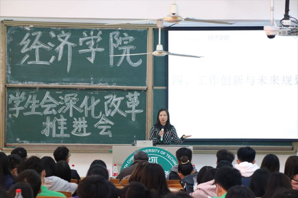 最后,李嘉雯为大会做学生会工作创新与未来规划主题演讲。她指出,学生会工作要根据学院的特色和具体情况开展,后改革时代的经济学院学生会要创新思维,提前规划。明确职能定位,摒弃娱乐化,重点在学业发展、身心健康、社会融入、权益维护等方面更好地服务同学。另外,要做好网络舆情的风险防控,警惕近期在全国范围内时有发生的学生会官僚作风问题,因此要特别加强学院团委的监督作用。同时,她也强调了学生会成员要协调好学习与工作的关系,学习是要摆在第一位的。
