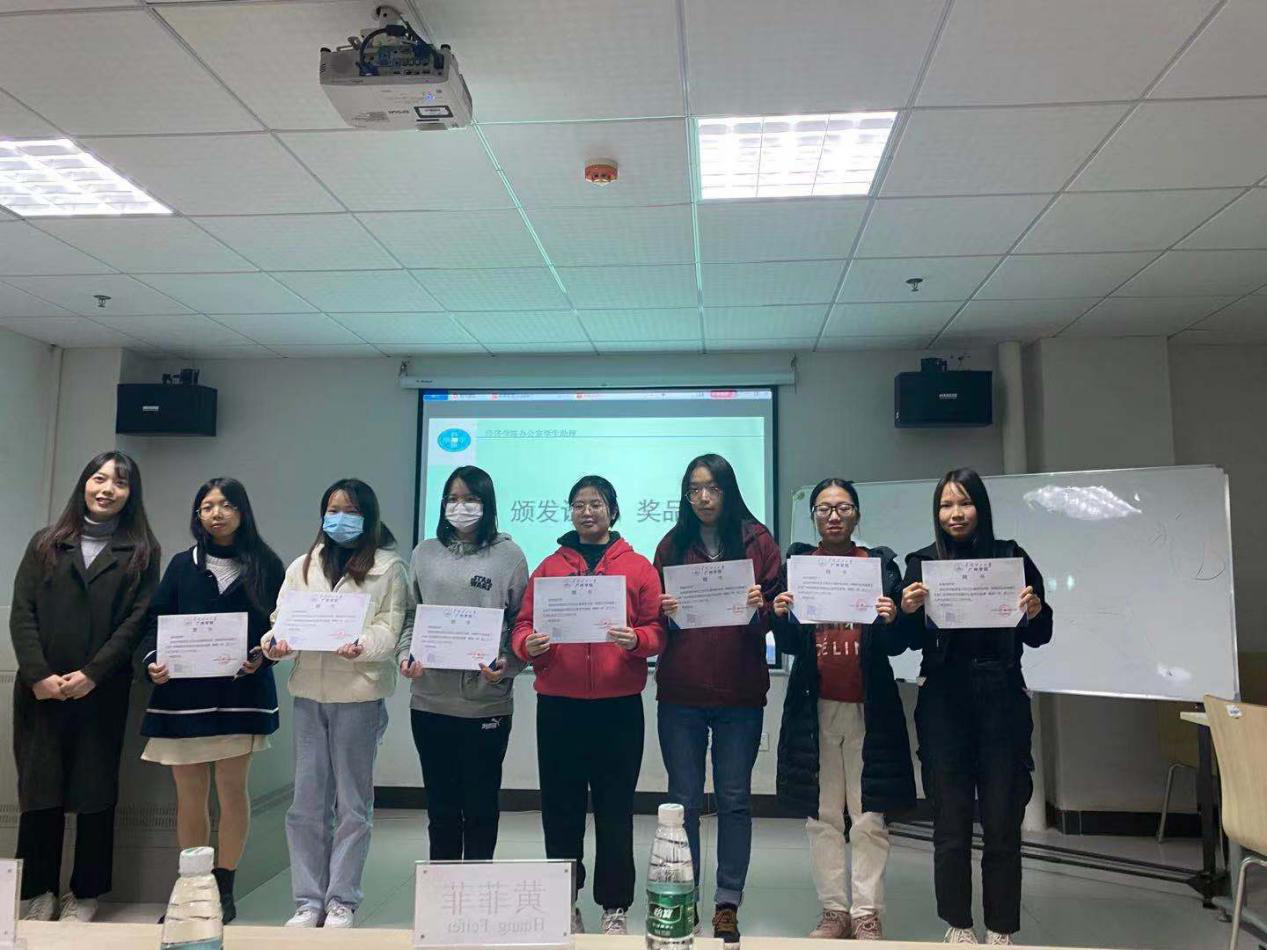 最后,由指导老师覃锐琦老师总结致辞,在回眸即将过去的2020,老师表示很欣慰和感动,欣慰学生助理们每一次成长,感动他们的点滴付出,简单又繁琐的助理工作,都是一种小小的历练,让每一位助理更好地锻炼自己的心智和能力。并祝愿我们,在充满希望的青葱岁月里,不负韶华,只争朝夕,追逐梦想。