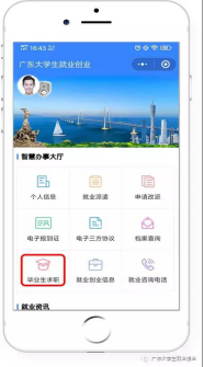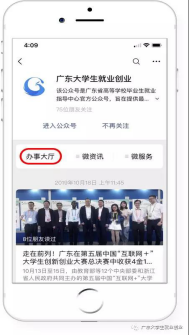 第一步:搜索“广东大学生就业创业”官方微信公众号并点击关注,进入菜单栏“办事大厅”。