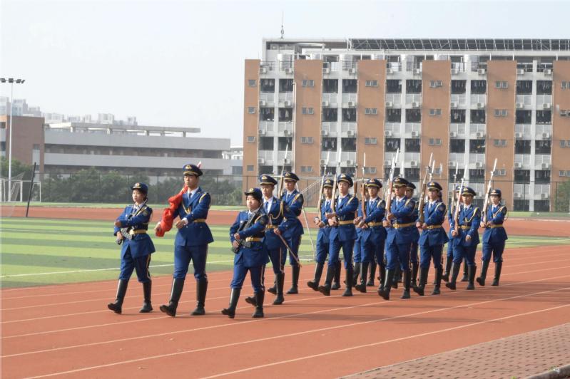 旭日东升,升旗仪式正式开始。国旗护卫队英姿飒爽,迈着铿锵有力的步伐进场。升国旗,奏国歌,行注目礼,国歌响彻云霄,五星红旗冉冉升起,迎风飘扬。