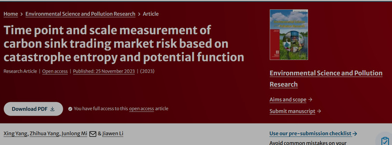 本网讯(记者 毛锦淇)我校经济学院粤港澳碳中和金融研究基地在“双碳”研究方面取得新进展。由经济学院杨星教授、米君龙讲师、李嘉雯讲师共同撰写的“Time point and scale measurement of carbon sink trading market risk based on catastrophe entropy and potential function”在《Environmental Science And Pollution Research》《环境科学与污染研究》期刊上发表。