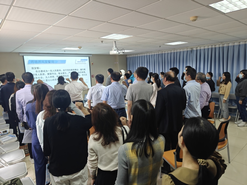 会上,学院党政办公室易兰花老师首先带领全体教师学习中共中央办公厅印发的《关于在全党开展党纪学习教育的通知》。通知指出,为深入学习贯彻修订后的《中国共产党纪律处分条例》,更好地引导党员干部学纪、知纪、明纪、守纪。任远以“教师的理想信念”为题,深入讲解了师德师风的重要性,他指出,教师的理想信念是教育工作的基石,一个拥有坚定理想信念的教师,能够在教学中注入更多的热情和智慧,从而激发学生的学习兴趣和潜能;而师德是教师职业道德的核心,它体现了教师的责任感、敬业精神和专业素养,只有教师的理想信念与师德师风紧密相连,才能成为一个拥有崇高理想信念、良好师德师风的优秀人民教师。随后,任远领导全体教师进行了庄严的师德师风宣誓。在宣誓仪式上,教师们肃立,举起右手,齐声诵读誓词,表达他们坚守师德、敬业爱生的决心和承诺。