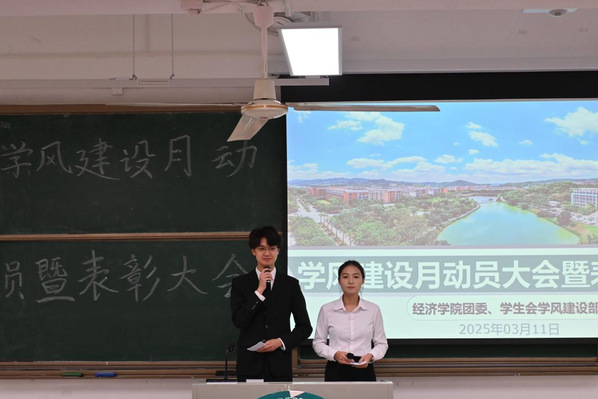 经济学院学风建设月动员大会暨表彰大会于3月11日在A5-101如期举行。经济学院院长王仁曾、党总支书记任远、学生工作办公室负责人张全胜以及各年级辅导员、班主任、各年级主要班委和学生代表共300余人参加。学院领导们在会上发表了重要讲话,深入阐述了学风建设对于学生成长成才、学院发展以及学科建设的重要意义。领导们强调,良好的学风是经济学院培养高素质经济人才的关键,是学院实现高质量发展的基石。会上,经济学院团委学风建设部负责人梁立佳同学详细介绍了本次学风建设月的活动安排,学风建设优秀学生代表也分享了自己的学习心得,激励着全体同学以更加饱满的热情投入到学习中。本次动员暨表彰大会的成功召开,为学风建设月的顺利开展奠定了坚实的基础,激发了同学们参与学风建设的积极性和主动性。