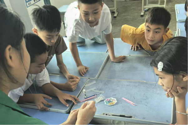 实践团成员向孩子们讲解螺钿工艺(吴坤颖 摄)