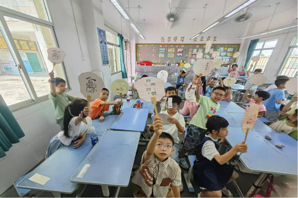 7月 17 日,实践团成员走进1-3年级教室,教孩子们制作漆扇,让孩子们从小接触这项渐被淡忘的非遗,感受老祖宗的智慧,为非遗传承打下基础。