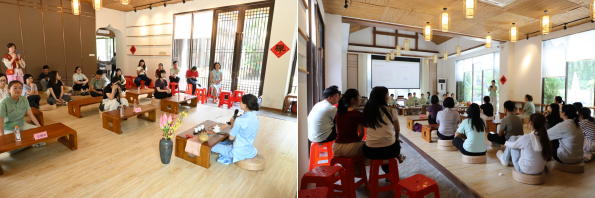 广东科技特派员专家吕海燕教授、广东白云学院农村科技特派员团队张闪闪、赖韵韵老师等30多位嘉宾及当地茶农、茶商为主的参训学员莅临禅域小镇旅游度假区茶艺培训现场,指导老师宗雅婷老师主持了启动仪式,详细介绍了实践团依托“校地共建非遗传承基地”开展的“五个一”行动计划,包括做一次禅茶文化调研、办一场乡村艺术表演、开展电商助农直播等。活动现场采用了“线下表演+线上直播”的方式,吕海燕教授通过平台全程直播,让更多人关注到本次活动。